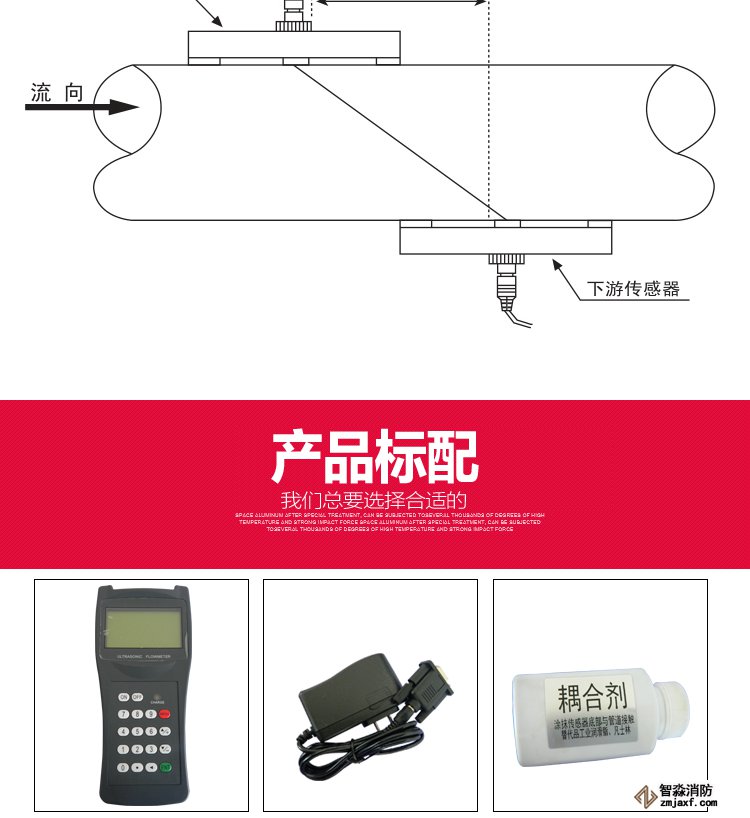 先將傳感器與主機相接,紅色傳感器接于上游端子,藍色傳感器放于下游端子。然后將兩個磁性傳感器與所測流量的管道連接,若不能相吸引,則采用支架將傳感器固定。固定好后打開主機輸入管道材質、直徑、傳感器距離,流體性質等相應的參數,即可開始測量。
