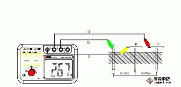 如下圖所示,將輔助接地棒P及C相距被測接地物間隔5至10米處以直線打入地下,將綠色線連接至儀器端子E,黃色導線連接至端子P及紅色導線連接至端子C。