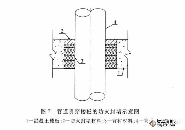(5)管道貫穿孔口使用阻火圈或阻火包帶進行封堵時要注意,安裝部位需位于墻體兩側或樓板下側;對于多種類型貫穿物混合穿越被貫穿體的部位,在有防火封堵板材或相應防火封堵組件中如采用阻火圈或阻火包帶,要按產品使用要求進行安裝,保證遇火時不脫落。