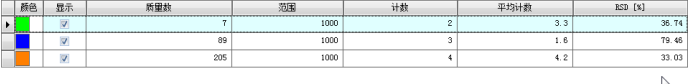 以1×10-2 mg/L Be、In、Bi、混合溶液進樣,測量質(zhì)量數(shù)9,115,209處的離子計數(shù),在不少于2h內(nèi),重復(fù)測量不少于10個數(shù)據(jù),并計算相對標準偏差RSD,即為儀器短期穩(wěn)定性。
