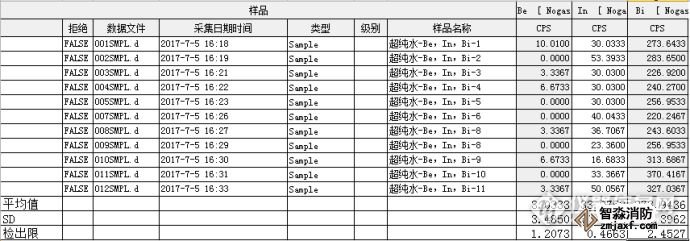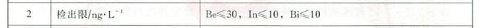 以18M Ω.cm的超純水進樣,測量測量質(zhì)量數(shù)9,115,209處的離子計數(shù),積分時間0.1s,分別測量11個數(shù)據(jù),用測量結(jié)果的標準偏差SA的3倍除以Be、In、Bi的寧明的S,結(jié)果即為各元素的檢出限,CL=3SA/S。