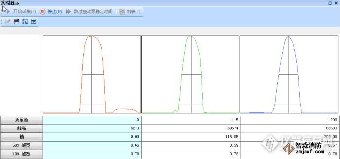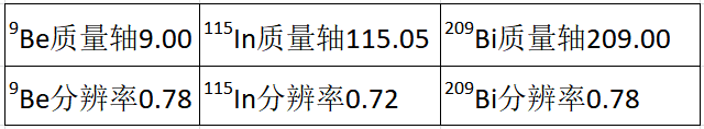 分辨率:以1×10-2 mg/L Be、In、Bi、混合溶液進樣,打印質(zhì)量數(shù)9,115,209的譜圖,并計算10%峰高處的峰寬度。