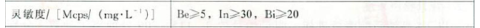 以1×10-2 mg/L Be、In、Bi、混合溶液進樣,測量質(zhì)量數(shù)9,115,209處的離子計數(shù),積分時間0.1s,分別測量20個數(shù)據(jù),取其平均值,在除以其準確濃度值,即為個元素的靈敏度S。