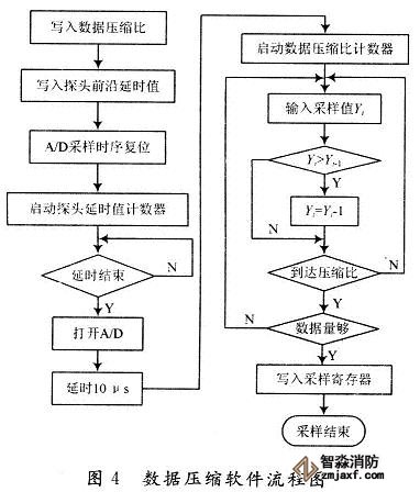 數(shù)據(jù)壓縮處理是對(duì)射頻信號(hào)高速采樣后進(jìn)行前置處理的重要環(huán)節(jié)之一,需要在保持超聲回波信號(hào)基本特征前提下對(duì)采樣數(shù)據(jù)進(jìn)行在線壓縮,而且要求壓縮后的數(shù)據(jù)與原始采樣信號(hào)的包絡(luò)相吻合。為此,在每次壓縮過(guò)程中,只取采樣所得的最大值,而舍棄其他采樣值。FPGA將計(jì)算所得采樣數(shù)據(jù)的壓縮比、探頭前沿延時(shí)計(jì)數(shù)值等數(shù)據(jù)送入相應(yīng)的鎖存器,然后發(fā)出時(shí)序復(fù)位命令并發(fā)射,啟動(dòng)探頭延時(shí)計(jì)數(shù),延時(shí)到后啟動(dòng)A/D采樣,同時(shí)壓縮比計(jì)數(shù)器開(kāi)始計(jì)數(shù),在時(shí)鐘信號(hào)的控制下,每采樣一次,壓縮比計(jì)數(shù)器減1,并將當(dāng)前采樣值與前次采樣值比較,如大于則保存,否則舍棄,直至壓縮比計(jì)數(shù)到零后,得到一個(gè)有效的采樣數(shù)據(jù)。同時(shí)壓縮比計(jì)數(shù)器自動(dòng)復(fù)位,重新開(kāi)始計(jì)數(shù),其工作流程如圖4所示。