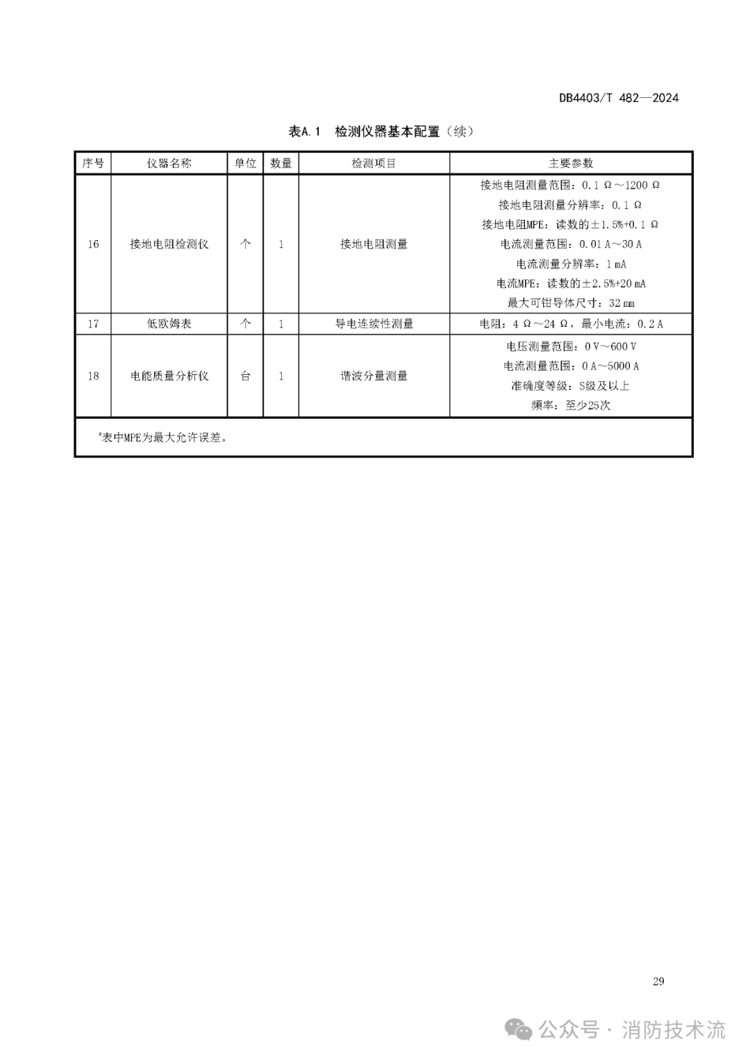 本文件規(guī)定了建筑電氣防火檢測的基本要求、檢測流程、檢測要求、建筑電氣火災危險及其等級評定、檢測記錄、試驗報告及檔案管理。本文件適用于交流10(20)kV及以下、直流額定電壓1500 V及以下電氣防火檢測。本文件不適用于生產和儲存火藥、炸藥、火工品和其他有爆炸危險場所,以及井下、航空、水上場所的電氣防火檢測活動。下列文件中的內容通過文中的規(guī)范性引用而構成本文件必不可少的條款。其中,注日期的引用文件,僅該日期對應的版本適用于本文件;不注日期的引用文件,其最新版本(包括所有的修改單)適用于本文件。GB/T 2099.1 家用和類似用途插頭插座 第1部分:通用要求GB/T 7260.1 不間斷電源系統(tǒng)(UPS) 第1部分:安全要求GB 8624—2012 建筑材料及制品燃燒性能分級GB/T 18487.1 電動汽車傳導充電系統(tǒng) 第1部分:通用要求GB/T 13539.1 低壓熔斷器 第1部分:基本要求GB/T 13955—2017 剩余電流動作保護裝置安裝和運行GB 14050—2008 系統(tǒng)接地的型式及安全技術要求GB/T 14549 電能質量 公用電網(wǎng)諧波GB/T 15945 電能質量 電力系統(tǒng)頻率偏差GB/T 16842—2016 外殼對人和設備的防護 檢驗用試具GB/T 16895.6—2014 低壓電器裝置 第5-52部分:電氣設備的選擇和安裝 布線系統(tǒng)(IEC 60364-5-52:2009,IDT)GB/T 31038 高電壓柴油發(fā)電機組通用技術條件GB/T 42710.1 家用和類似用途直流插頭插座 第1部分:通用要求GB/T 50065 交流電氣裝置的接地設計規(guī)范GB 50084 自動噴水滅火系統(tǒng)設計規(guī)范GB 50171—2012 電氣裝置安裝工程 盤、柜及二次回路接線施工及驗收規(guī)范GB 50217—2018 電力工程電纜設計規(guī)范GB 50303—2015 建筑電氣工程施工質量驗收規(guī)范電氣設備 electrical equipment用于發(fā)電、變電、輸電、配電或利用電能的設備。用電設備 current-using equipment用于將電能轉換成其他形式能量的電氣設備(3.1)。電氣裝置 electrical installation由相關電氣設備(3.1)組成的,具有為實現(xiàn)特定目的所需的相互協(xié)調的特性的組合。電氣設備(3.1)或電氣線路發(fā)生電氣故障而引發(fā)的火災。在系統(tǒng)、裝置或設備的給定點與局部地之間進行電連接。[來源:GB/T 2900.1—2008,3.5.6]系統(tǒng)接地 system grounded將已停電的帶電部分接地(3.5)、以便在無電擊危險情況下進行作業(yè)。保護接地 protective grounding為了電氣安全,將系統(tǒng)、裝置或設備的一點或多點接地(3.5)。[來源:GB/T 2900.1—2008,3.5.9]埋入土壤或特定的導電介質(例如混凝土或焦炭)中、與大地有電接觸的可導電部分。[來源:GB/T 2900.1—2008,3.5.17]在系統(tǒng)、裝置或設備的給定點與接地極(3.8)或接地網(wǎng)之間提供導電通路或部分導電通路的導體。[來源:GB/T 2900.1—2008,3.5.19]被接地體與地下零電位面之間接地引線電阻、接地器電阻、接地器與土壤之間的過渡電阻和土壤的溢流電阻總和。[來源:GB/T 2900.1—2008,3.2.55b﹚]保護導體 protective conductor[來源:GB/T 2900.1—2008,3.5.24]兼有保護接地(3.7)導體和中性導體(3.12)功能的導體。[來源:GB/T 2900.1—2008,3.5.27]等電位聯(lián)結 equipotential bonding[來源:GB/T 2900.1—2008,3.5.8]等電位聯(lián)結導體 equipotential bounding conductor用于保護等電位聯(lián)結(3.15)的保護導體(3.13)。剩余電流保護裝置 residual current protective device在正常運行條件下能接通、承載和分斷電流,以及在規(guī)定條件下當剩余電流達到規(guī)定值時能使觸頭斷開的機械開關器件。以傳導或無線方式與電動汽車或動力蓄電池連接,為其提供電能的設備。防火分區(qū) fire compartment在建筑內部采用防火墻(3.21)、耐火樓板及其他防火分隔設施分隔而成,能在一定時間內防止火災向同一建筑的其余部分蔓延的局部空間。[來源:GB/T 5907.2—2015,2.1.3]防止火災蔓延至相鄰建筑或相鄰水平防火分區(qū)(3.20)且耐火極限不低于3.00 h的不燃性實體墻。[來源:GB/T 5907.2—2015,2.1.6]公共娛樂場所 public entertainment occupancies具有文化娛樂、健身休閑功能并向公眾開放的室內場所。注:公共娛樂場所包括影劇院、錄像廳、禮堂等演出、放映場所,舞廳、卡拉OK廳等歌舞廳娛樂場所,具有娛樂功能的夜總會、音樂茶座、酒吧和餐飲場所,游藝、游樂場所,保齡球館、旱冰場、桑拿等娛樂場所、健身、休閑場所和互聯(lián)網(wǎng)上網(wǎng)服務營業(yè)場所。可能導致火災發(fā)生或火災危害增大的各類潛在不安全因素。4.1.1電氣設備表面應保持清潔,電氣設備及線纜的外觀應完好、無裂紋、破損、燒蝕等現(xiàn)象,外殼、漆層、手柄應無損或變形,緊固件無松動。4.1.2電氣裝置應有銘牌標識且應齊全、清晰、易見,實行生產許可證或強制性認證(CCC認證)的設備,應有許可證編號或CCC認證標志或應能提供相應的質量合格證明文件。4.1.3運行中的電氣設備的周圍環(huán)境應符合產品的技術要求,周圍應無易燃易爆物品及其他雜物,無滲水、漏水現(xiàn)象。4.1.4電氣設備及線路不應直接安裝在可燃材料上。4.1.5電氣設備的外部接線應按接線端頭標識進行,每個接線端子的每一側應接一根導線,最多不應超過2根導線。4.1.6裸帶電導體與電氣設備連接時,其電氣間隙不應小于與其直接連接的電器元件的接線端子的電氣間隙。4.1.7電氣設備的外露可導電部分應單獨與保護導體相連接。不應串聯(lián)連接,連接導體的材質、截面積應符合設計要求。4.1.