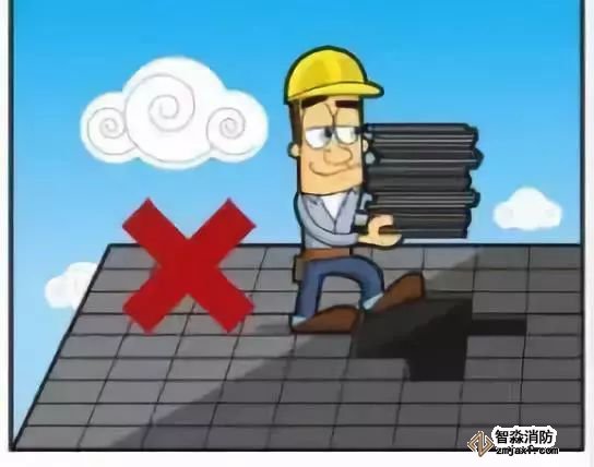 提醒:作業開始前,工人要檢查作業環境是否安全,在輕型屋頂和不牢固的搭建物上作業時,必須采取可靠的防護措施。在石棉瓦、玻璃纖維瓦等輕型屋面上作業時,必須搭設墊板供施工作業使用或行走,墊板下方還應搭設安全網。