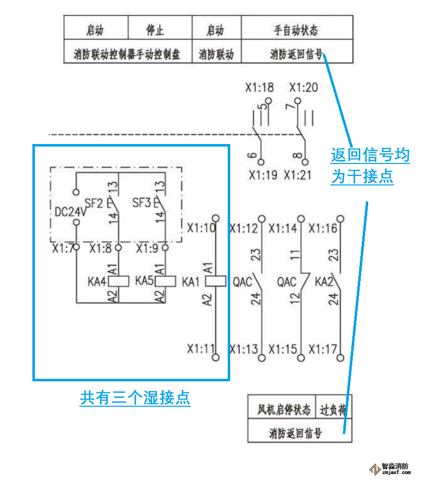 聯動觸發信號(自動啟動,總線) 和手動控制信號(手動啟、停,專線),兩種信號均為DC24V有源觸點,消防信號中間繼電器設于消防水泵控制箱內,滿足GB50116-2013第4.1.1條,4.1.3條。