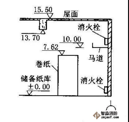 對于儲備紙庫,以消防員站在0.00m標高地面上,按式(1)計算,水槍充實水柱應在16.7~20.5m之間。故向建筑專業提出要求,在紙庫內墻10.00m標高處增加一圈馬道,在馬道設置消火栓,以減少充實水柱長度,見圖1。印報機廠房在0.00m標高和4.00m標高各有一個工作平臺。以消防員站在4.00m標高平臺,按式(1)計算,水槍充實水柱應在20.6~25.2m之間。故考慮在廠房北邊11.50m標高屋面上設置消火栓,通過廠房高大的窗戶向室內噴水。在廠房南邊10.00m標高的參觀廊(屬于另一防火分區)設專門的消防栓小間,供消防員使用,消火栓小間用甲級防火門與參觀廊隔開,見圖2。按圖2設置消火栓,水槍充實水柱為15m,在11.50m標高屋面上水槍上傾角為45°,在10.00m標高的消火栓小間水槍上傾角為53°,就可以滿足滅火要求。