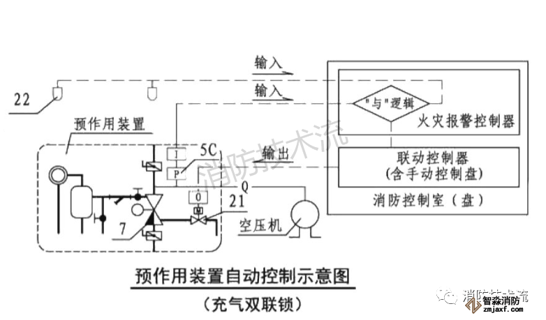 為避免誤噴,預作用系統采用雙鎖預控制。雨淋閥的基本閥體為水力控制閥,雨淋閥啟閉同時受互相串接的電磁閥和PORV壓力控制導閥的控制,預作用系統閥后管道中充有0.2MPa的氣壓,以監測管道的氣密性及維持管道干燥。當電探測器誤動作時,電探測器向預作用控制盤輸出信號,控制盤發出報警信號并發出電磁閥開啟信號。電磁閥打開,但由于PORV壓力控制導閥仍然關閉,故雨淋閥不動作。反之,由于管道或噴頭破損造成系統內氣壓下降以至PORV壓力控制導閥打開,但與之串接的電磁閥沒打開,故雨淋閥仍不動作。當管道中氣壓降到0.15MPa時,低氣壓監測開關向控制盤輸入信號,控制盤發出低氣壓報警,啟動空氣壓縮機。只有電探測器發出火災報警信號,且噴頭爆破造成系統內氣壓迅速下降,電磁閥和PORV壓力控制導閥均打開,雨淋閥才動作,水流促使高壓水流報警開關動作,向控制盤發出已啟動報警閥的信號。系統原理見圖3。