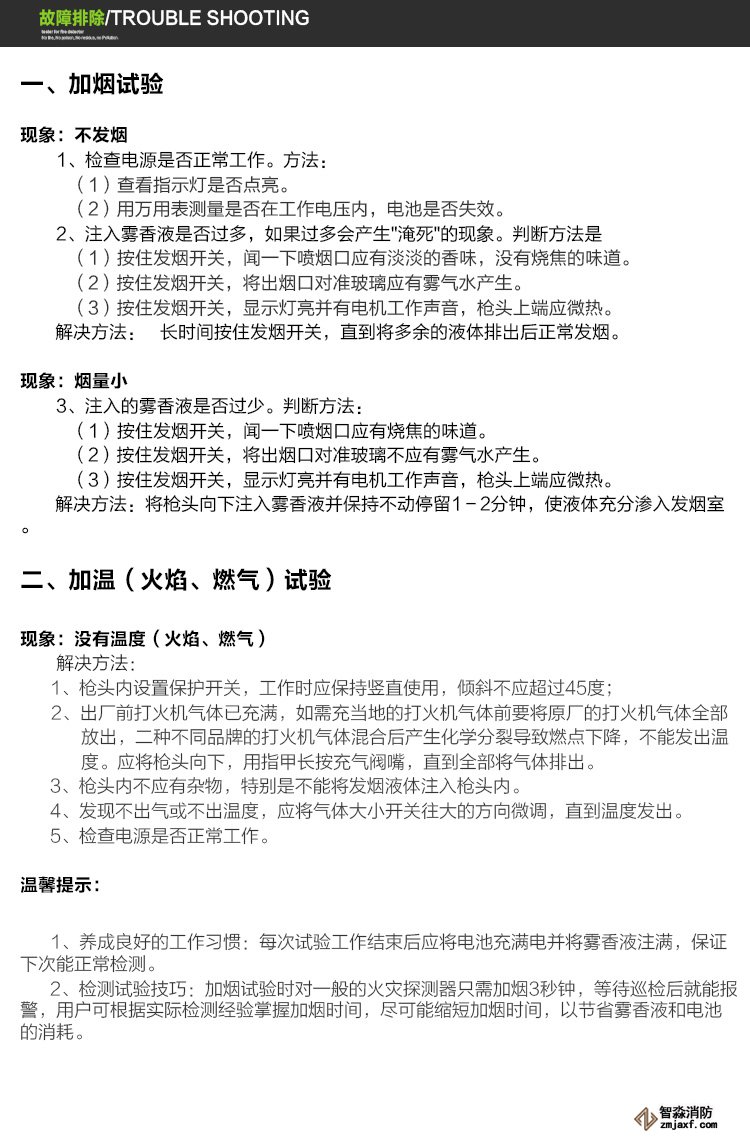 ◎ 發煙采用特制環保型霧香液,代替原有的棒香發煙,不產生煙灰、煙油,不會對探測器造成二次污染;發煙過程采用內部循環技術,霧香液自然損耗,延長霧香液使用時間。