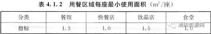 1、飲食或餐飲建筑可根據用餐區域的每座最小面積計算安全疏散人數,用餐區域每座最小使用面積宜符合表4.1.2的規定。(4.1.2)