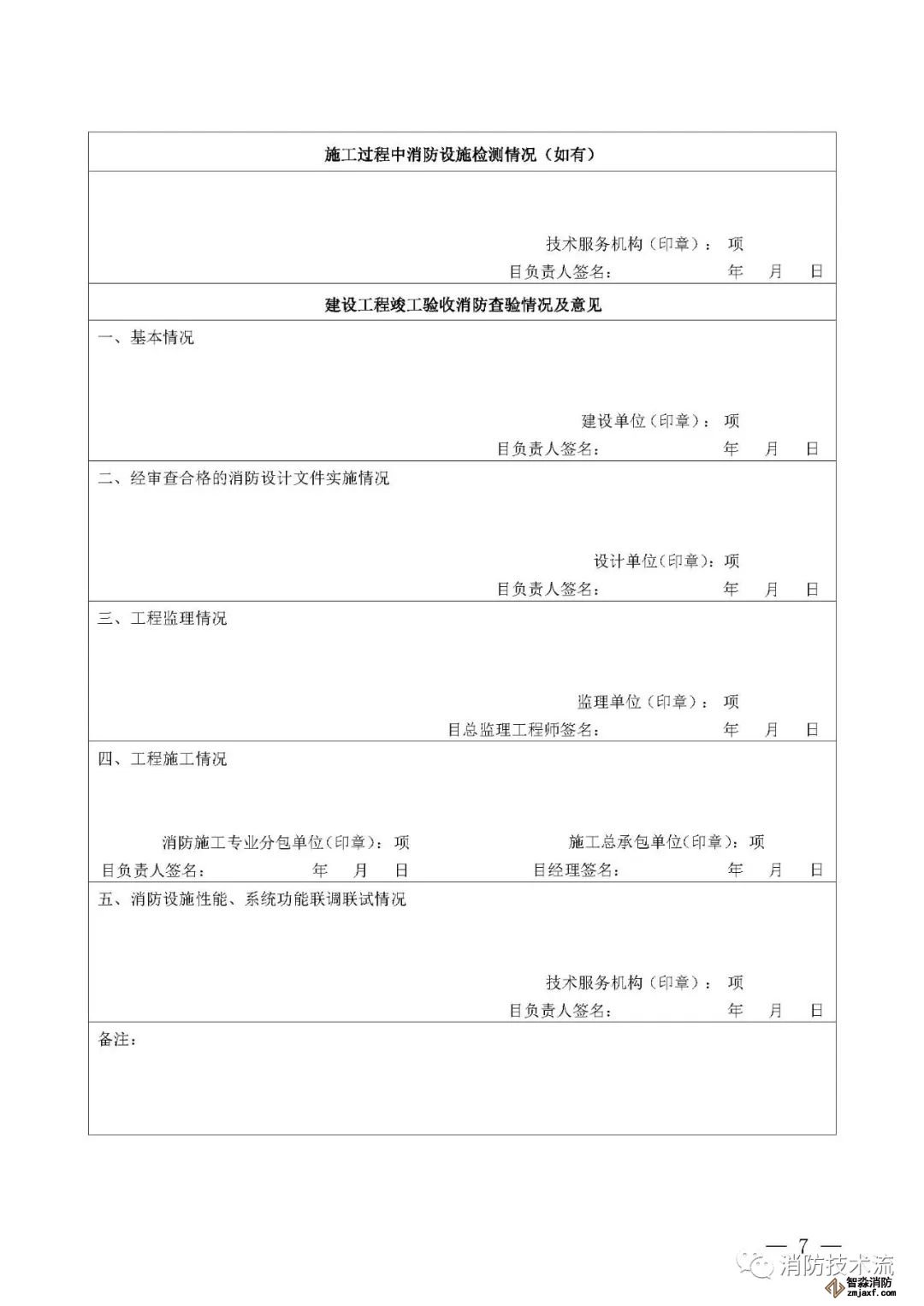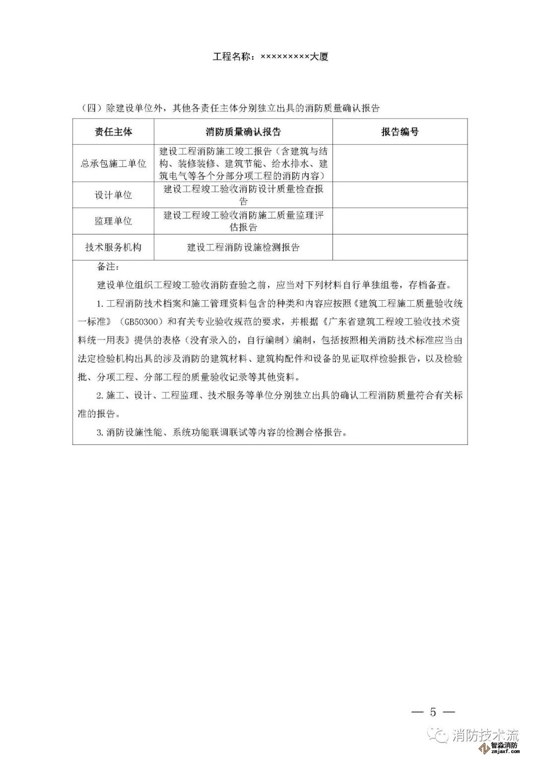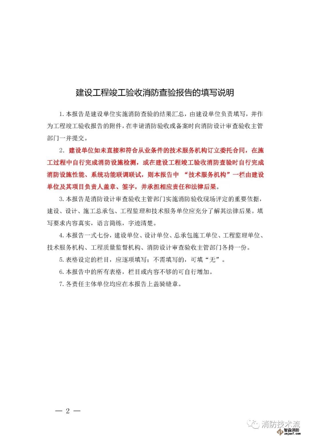 其中附件2和附件5中的填表說明均表示: 建設單位如未直接和符合從業(yè)條件的技術服務機構訂立委托合同,在施工過程中自行完成消防設施檢測,或在建設工程竣工驗收消防查驗時自行完成中 消防設施性能、系統(tǒng)功能聯(lián)調聯(lián)試,則本報告中 “ 技術服務機構 ” 一欄由建設單位及其項目負責人蓋章、簽字,并承擔相應責任和法律后果。
