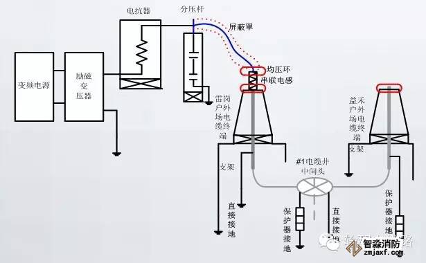 變頻諧振系統輸出的電源不能直接作為電纜局放試驗的電源直接施加于被試對象進行局部放電測試,必須采取有效措施對試驗電源進行預處理,通過設置串聯電抗、防暈導線、均壓環進行對試驗電源質量進行改善,其電氣原理所下圖所示。