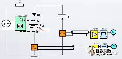 在被試驗電纜Cx注入標準局放信號Qo以模擬被試對象發生了局部放電,當標準局放信號注入時,檢測阻抗Zm1、Zm2輸出信號,測試系統M獲取局放信號的幅值大小、相位分布特征、頻譜特性等信息。