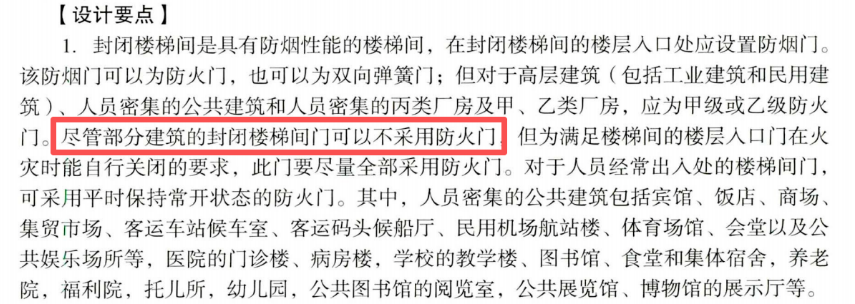 而針對封閉樓梯間,沿用建規的,除了甲、乙類廠房,多層丙類廠房,人員密集的公共建筑和其他高層工業與民用建筑中封閉樓梯間的門,并沒有強調要求使用防火門。